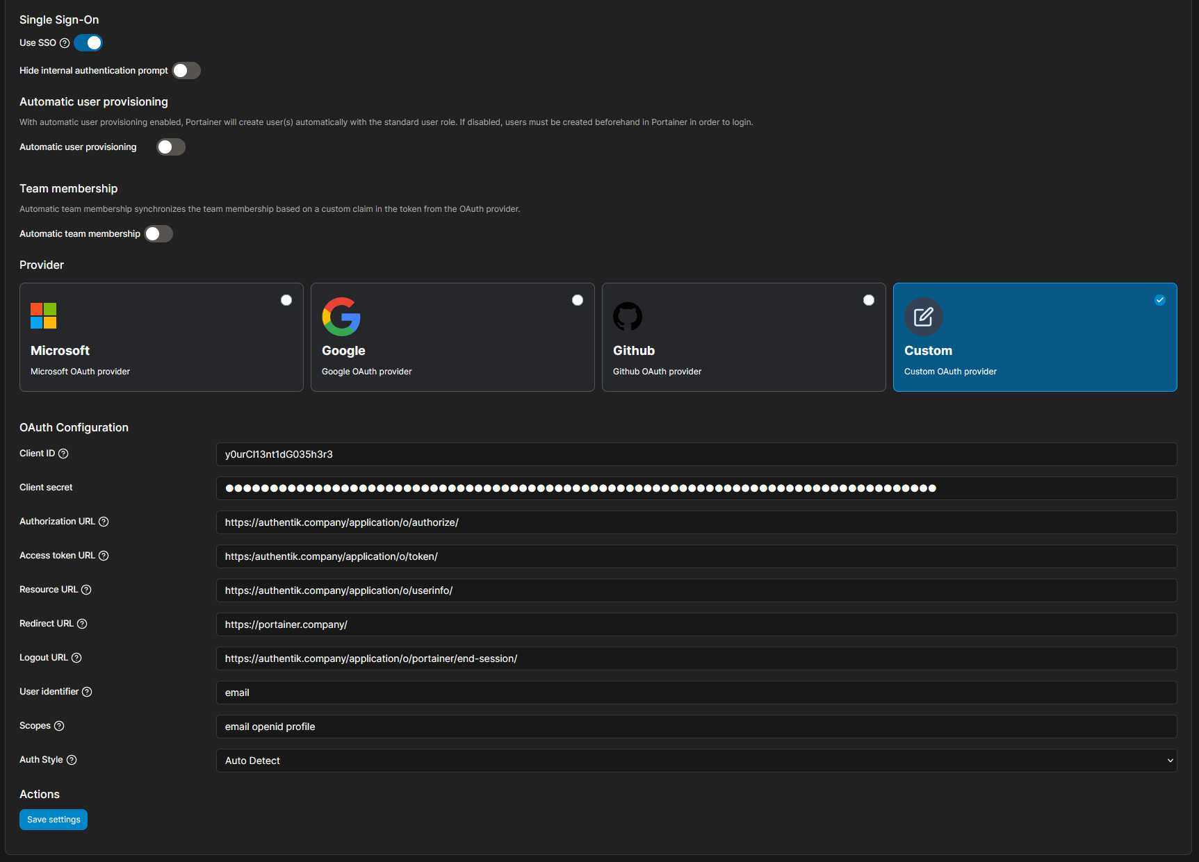 - Client Secret: The 'Client secret' from the authentik provider